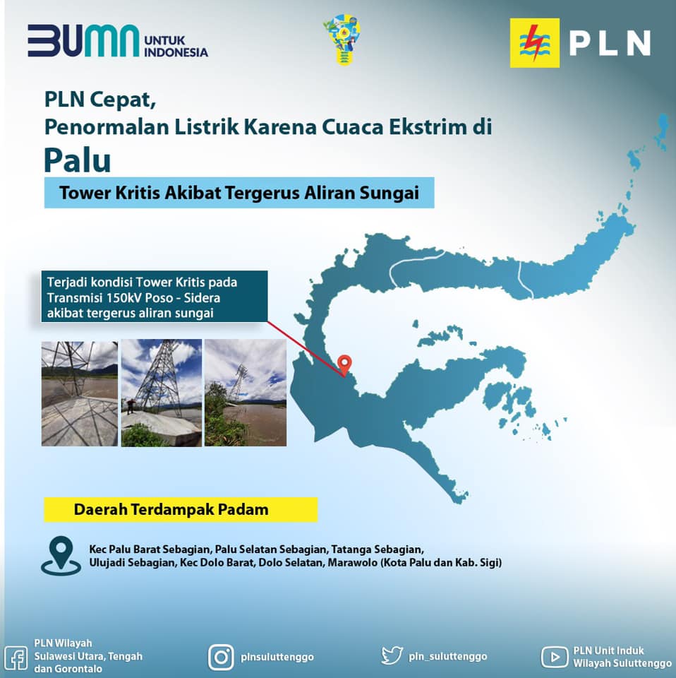 Manager Unit Pelaksana Pelayanan Pelanggan Palu, Wardi Hadi menyampaikan permohonan maaf karena kelistrikan di wilayah Palu akan mengalami penghentian pasokan listrik untuk sementara akibat kondisi Emergency Tower Transmisi.