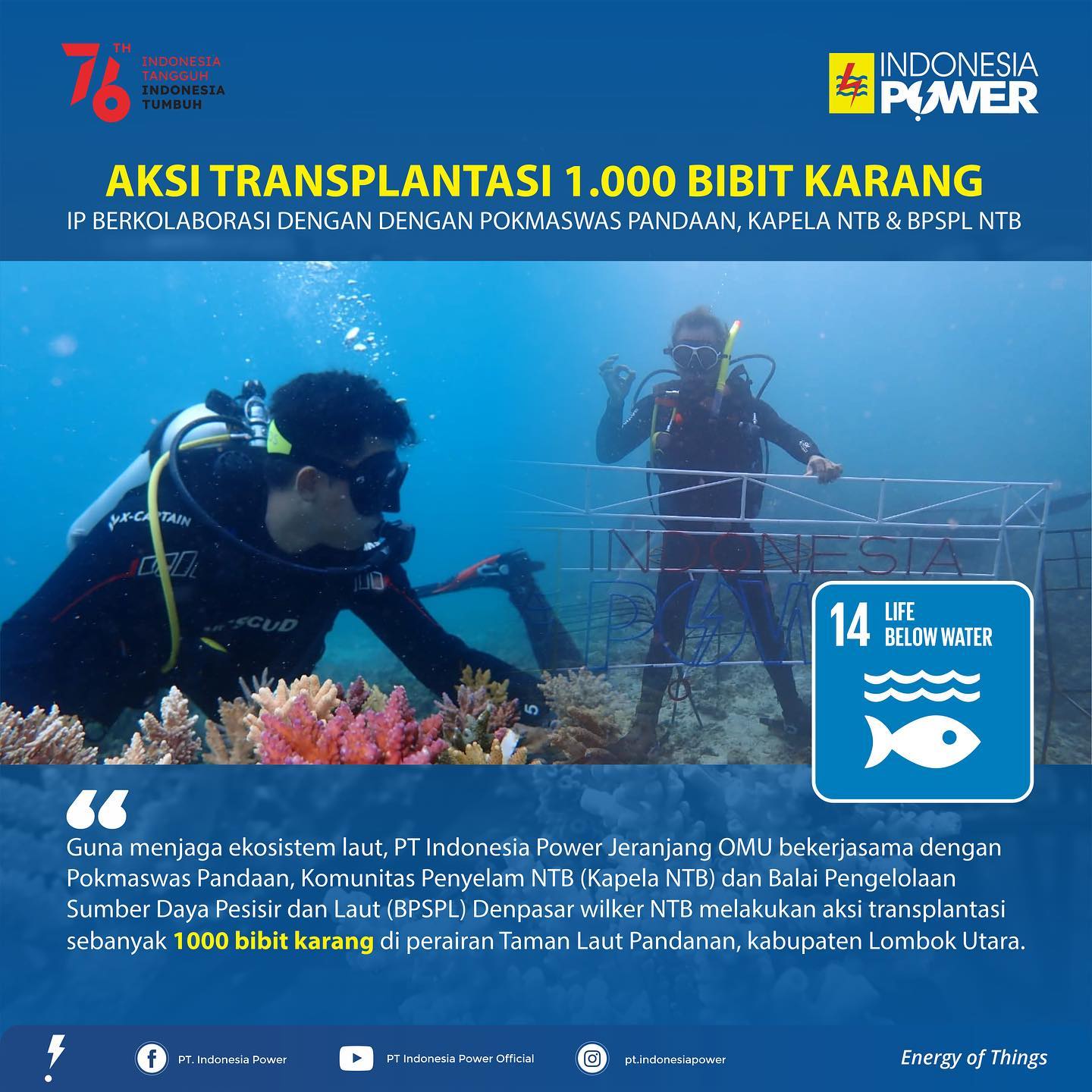 energikita.id – Sebagai bentuk kepedulian dan tanggung jawab perusahaan karena sebagian besar pembangkit yg dikelola Indonesia Power merupakan pembangkit thermal yang berlokasi di daerah pesisir, Indonesia Power Jeranjang OMU bersinergi dengan stakeholder terkait dan masyarakat setempat turut menjaga ekosistem laut melalui aksi transplantasi atau penanaman 1000 bibit karang di Taman Laut Pandanan, Kabupaten Lombok Utara.