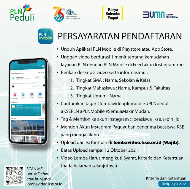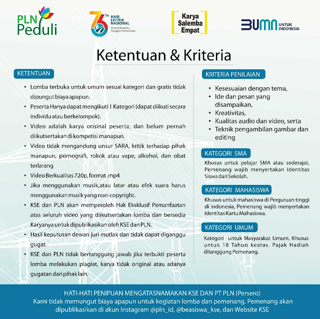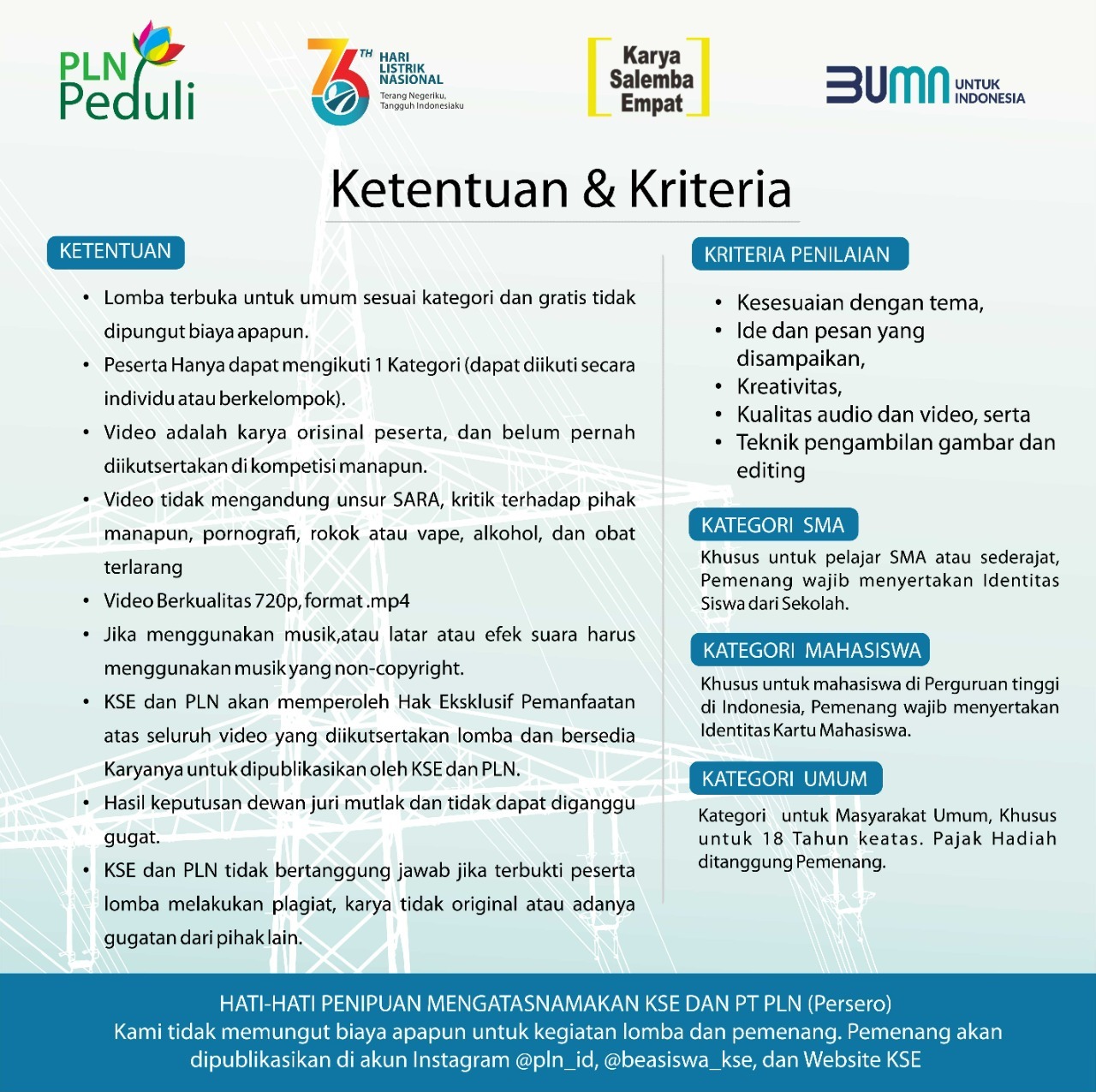 Ketentuan dan kriteria lainnya dapat diakses di akun instagram @pln_id, @beasiswa_kse dan web kse.or.id.